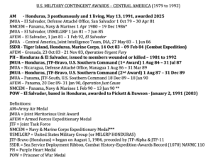 The following chart, created by USContraWar, raises several important questions. For example, why aren’t the Honduran deployments of U.S. military members officially recognized as a foreign campaign and why aren’t these deployments listed in Service Members records? The clearly defined enemy was Nicaragua with Soviet/Cuban support of communist expansionism throughout Latin America, dozens of Purple Hearts were awarded to U.S. Service Members stationed in Honduras, two Honduras based U.S. Service Members received the POW Medal and at least one U.S. service member was killed in action in Honduras; yet the U.S. Government classifies these deployments as training and war games. U.S. troops were deployed to Honduras beginning in 1980 and remained throughout the conflict. Some U.S. troops are still stationed in Honduras today.
