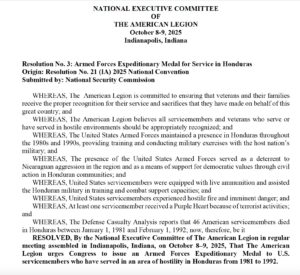On October 8, 2025 at the American Legion fall NEC meeting in Indianapolis, IN the legionnaires voted and approved Resolution #3 – Armed Forced Expeditionary Medal for service in Honduras. THANK YOU!