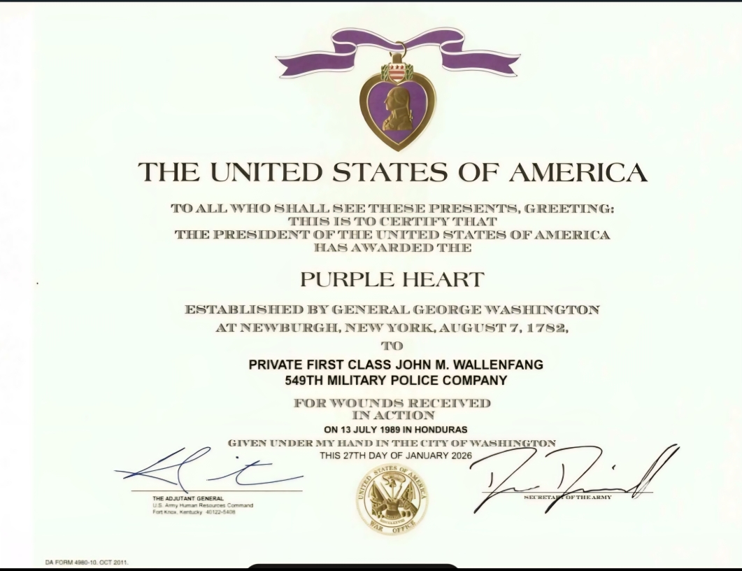CONGRATULATIONS – SPC John Wallenfang was just awarded the Purple Heart during the same attach as SPC Mike Barge below. That makes 48 Purple Hearts during our so-called ‘training & war games.’ John’s public ceremony will be held on April 11, 2026 near Green Bay, WI. USContraWar has invited Secretary of War Pete Hegseth to attend this honorable event.